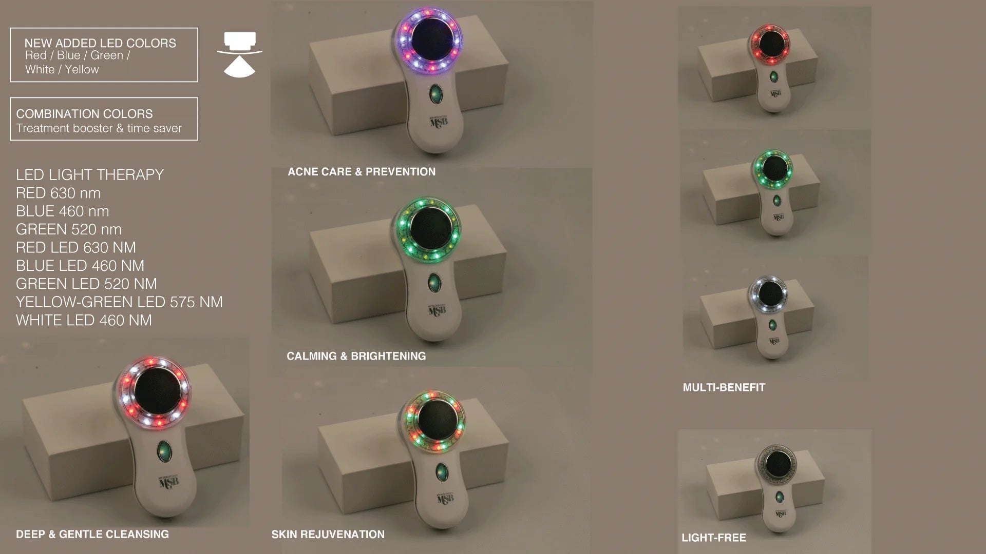 ** LED Therapy**: Red 630 nm / Green 520 nm / Blue 460 nm / 1 watt output / 6 bulbs / Eye Safe / Home safe